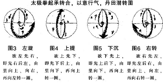 锻炼时以意行丹田真气,不外乎以下8种转换图式。若内气运行作左旋则如图3,直上提如图4,直下沉如图5,右转如图6,左上提如图7,右上提如图8,右下旋如图9,左下旋如图10。此8幅图合为一圆球整体图,是陈氏太极拳的传人陈照奎老师(1927—1981)所传授的丹田内转练习法。不过这一起承转合,在外形上是视之不见的,随着这一内意的走向来引导行功走架,使外形齐动的。