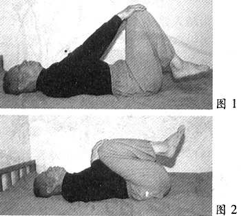 2、两腿慢慢抬起回收,两臂向上,两手自然地抓住两膝(图1)做腿膝开合。两手往回拉,使两大腿贴于身体(图2),此为合,再把两膝往前推,恢复图1状,此为开。反复3次后,两手松开落于体侧。