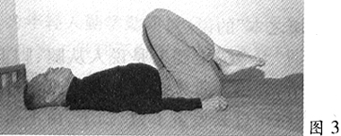 3、两腿向上绷直;然后两小腿弯曲下落,两足跟击打臀部(图3),然后再向上绷直,反复击打臀部3次。