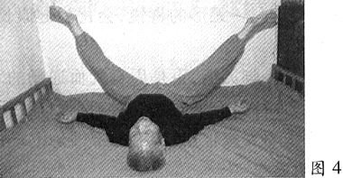4、接做两腿开合:两腿向左右张开,开至极限,同时两小臂也张开(图4),然后再往回合,如此开合3次后再恢复图3状。