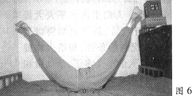 7、接着再做两腿开合,开时开至极限(图6),合时合回原处。开合3次后,恢复向上绷直状。