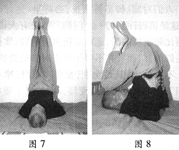 8、两腿连同臀部一起向上绷直,同时松开握拳的两手随即叉腰,大拇指在前,4指在后,两肘直起,与颈椎部形成一个三角形支点,使腿与臀部悬空(图7)。然后两小腿下落,两大腿向前、向下合,两膝盖尽量与额头相触(图8),然后再开出去,恢复悬空状,反复3次。