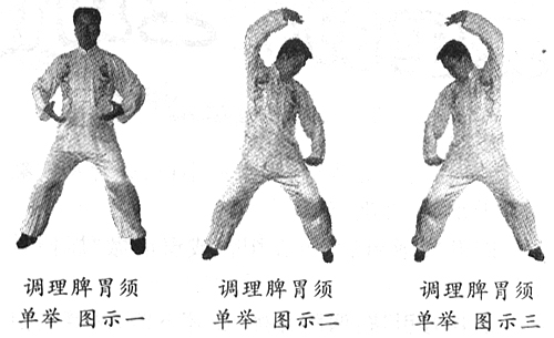 “调理脾胃须单举”动作:两脚平行,略宽于肩。两臂自然下垂,两手转掌心向上,然后慢慢向上捧起至胃前,两手上下分开,左手在上,右手在下,眼看右手之虎口,还原至胸腹前。