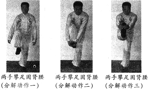 动作:右脚收拢,重心左移。右腿曲膝抬起,同时两手十指交叉,扣住脚底,右脚向正前方蹬出。然后右脚收回,两手松开。右脚落地后,重心右移,做右势。右势与左势相同,惟动作相反。左右为一动,七动为一组。