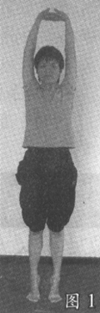 吸气,脚跟抬起,脚尖支撑,手臂带动整个身体向上方伸展(图1)。保持三至五次呼吸的时间。