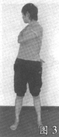呼气,身体向右侧扭转,将左手放到右肩上,右手放在腰部后方,保持脊柱挺直,眼睛看向身体的后方(图3)。