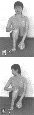 屈膝,将左脚脚背放在垫子上,臀部坐在左脚后跟上,双手放在膝盖上(图6)。