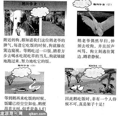 看(出示漫画图),这就是“架子十足的鹅老爷”,这就是偷饭吃的调皮狗。它们之间都有哪些有趣的对话呢?
