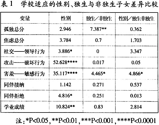 为了清楚地了解农村学生在学校适应各个指标上的差异,笔者以性别、独生/非独生为自变量,以学校适应作为因变量进行2×2方差分析,用以考察农村学生学校适应的性别差异、独生/非独生差异。结果如下: