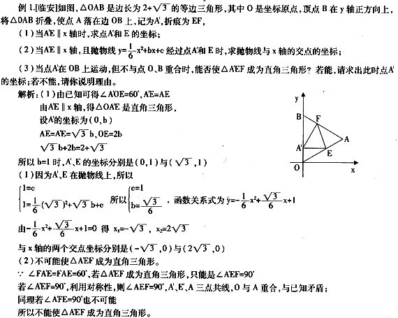 [评析]此题把三角形的折叠放到坐标系中来研究,综合考察了折叠的性质,求点的坐标,求抛物线的解析式,直角三角形的判别等知识,既是代数与几何的有机结合,又有运动与静止的辩正统一,有梯度,又有一定的难度,需要学生具有扎实的基本功和综合运用数学知识解决问题的能力。其中第(3)小题还要能够根据条件和图形的特点进行合理猜想,运用反证法来合理验证,体验了新课程的理念。