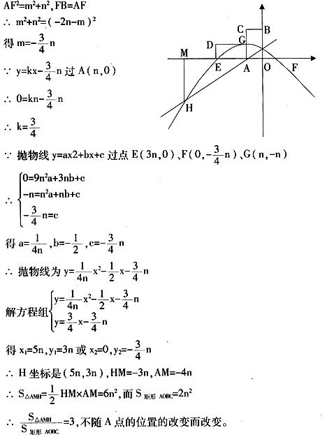 例2.[宜昌]如图,点O是坐标原点,点A(n,0)是x轴上一动点(n<0)。以AO为一边作矩形AOBC,使OB=2OA,点C在第二象限。将矩形AOBC绕点A逆时针旋转90°得矩形AGDE。过点A得直线y=kx+m(k≠0)交y轴于点F,FB=FA。抛物线y=ax2+bx+c过点E、F、G且和直线AF交于点H,过点H作x轴的垂线,垂足为点M。