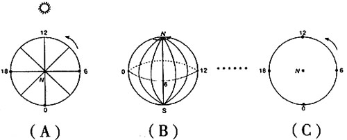 “地球钟”计时法关键是学生能理解原理,并能把对原理理解用自己的方式用示意图呈现出来。这无形中就训练了学生表达成果和思想的能力。只有这样才可以真正理解原理,并且利用示意图,应用原理去解决时间计算问题。那么,如何让学生掌握好示意图呢?在教学中可以遵循由感性到理性,由形象到抽象的原则,让学生动眼观察动手演示,动手画、动脑思考设计示意图(教师提示:北极上空看怎么画,南极上空看怎么画……)。引导学生之间互相探讨各自画法的优缺点,然后教师挑几幅进行评价,这样最终得到一幅大家“共同创作”简单实用的简图(C)。满足学生成就感,培养学生参与意识自主意识,激发学生进一步探究热情,这个过程中培养了学生自主学习、合作学习、探究学习的意识和能力。