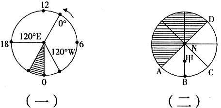 例题2:(2000年文综),读图(二)园心点为地球北极,回答: