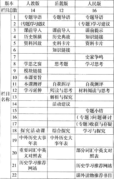 一、 三种版本《历史》(必修)教材栏目设置数据统计