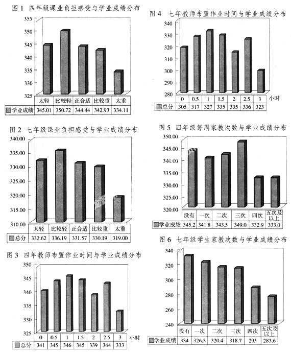 从图1、图2看,四、七年级学生课业负担主观感受与学业成绩的相关曲线基本呈倒“U”形,课业负担太轻,学业成绩不是最好;课业负担太重,学业成绩最差;课业负担比较轻时,学生的学业成绩最好。