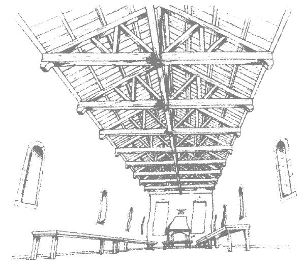 她是在高处,位于开放式天花的大木梁之间。她看了看三十英尺下方的桌子。正前方是与大厅等长的巨大中檩。每隔五英尺就有一根两端搁在两边墙上的横梁与之相交。所有的梁都经过精雕细刻,而且每隔一段都进行了交叉加固。