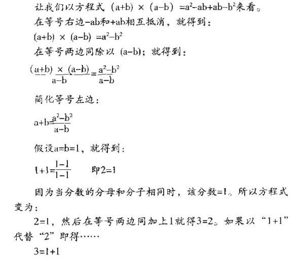 顺便提一下,“1+1=3”会让许多人感觉不舒服,因为他们认为一条哲学原理从数学上讲是错误的便毫无意义。我不得不向你们证明在数学上这是完全正确的,我毫不在乎这是否是一条悖论:我将在我的坟墓里摧毁你们的自信。我将向你们证明你们所认为的“真理”只不过是无数真理中的一条而已,让我们开始吧。