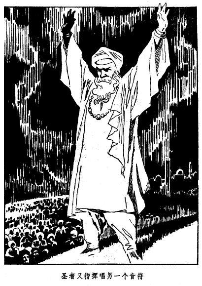 圣者把那双长臂平举至齐肩高,停一下,再继续上举。只见他那筋骨嶙峋的手背在头顶上碰在一起,便停了一下,然后又猛然把双臂甩下,象指挥一支大型管弦乐队演奏似的。