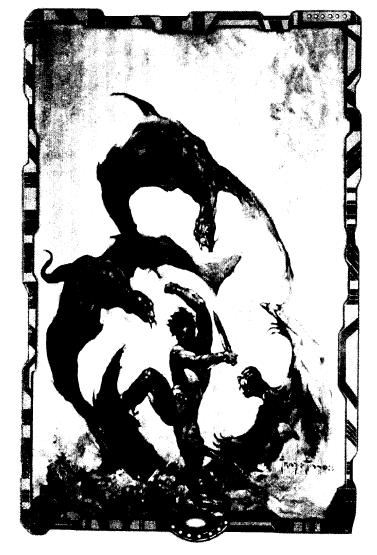 你不妨想像一下,一个巨大的灰熊,长着十条带着利爪的腿,一张青蛙一样的大嘴从一只耳朵张到另一只耳朵,露出三排又长又白的獠牙。这还不够,你还得发挥你的想像力,想像出一只半饿的孟加拉虎的敏捷和凶残和一队公牛的蛮力。这样你或许能对沃拉行动时的样子有一点模糊的认识。