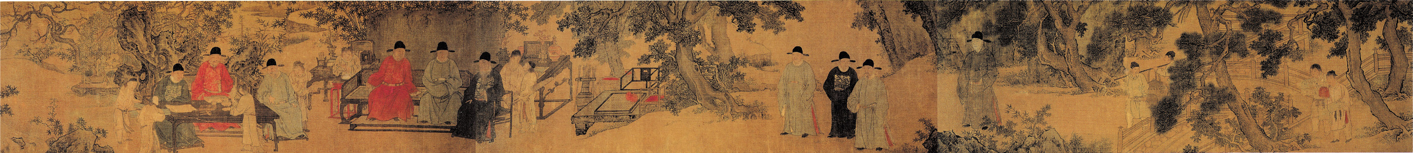 谢环,生卒年不详,字廷循,永嘉(今浙江温州)人。后以字行,知学问,喜赋诗。宣德年间征入画院,大被赏遇,授锦衣卫千户,后又升指挥。擅画山水,师张菽起,并宗荆浩、关仝、米芾,洪武时已有盛名。此图绘大学士杨荣、杨士奇、杨溥及阁员五人雅集杨荣家的杏园中,宫廷画家谢环亦被邀参加并作此图,共画了二十四人之多,画家本人亦入画中,是当时仕宦生活的真实写照。