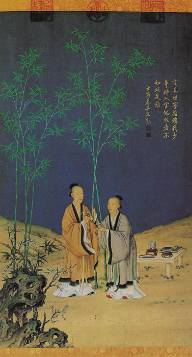 郎世宁画风写实,工整富丽,兼具中西绘画之风。虽然并未在清代蔚然成风,却也吸引了很多人竞相模仿。《平安春信图》中人物写实,动作略嫌呆板,却有西画的凹凸感和体面感。画中几案树石参用中国花鸟画法,画风靡丽而略显滞闷。