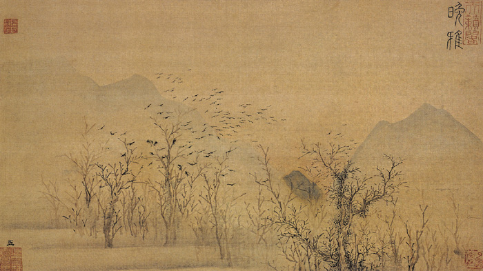 此画画法简逸,描绘的是渔父、放鸭、听雨、踏雪等村居乐事。其中“渔父”一图,画渔夫们在水上捕鱼,水波滟潋,细柳飘浮,芦苇摇荡,一幅优美的渔民生活图景。“放鸭”一幅也别有情致,河中的鸭子情态各具,画法简率,意境清美。“听雨”画大雨滂沱,狂风大作,雨中一人正撑伞而行,低头躬身,行步艰难,整幅作品将风雨大作的天气生动地表现出来。“踏雪”一幅也很有情趣,一长者正携书童顶雪在雪地行走,是一幅典型的文人生活趣图。画法粗简,皴染结合,背景晕染得体,画境高寒。