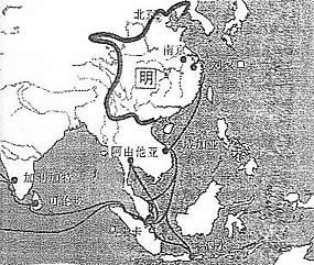 西元一三七一~一四三四年。昆阳(今云南省普宁县)出身。西元一三八二年当明征服云南之时成为宦官,出仕于燕王,亦即后来的永乐帝。代代均为伊斯兰教徒,其郑姓亦为永乐帝所赐。有时亦被称为三宝太监,太监指的乃是宦官。他在宦官之中确实算是十分伟大,活跃于永乐帝的军事政策之中,特别是前后七次、历时三十年的南海远征最为有名。全从东南亚进入印度洋,最远还到达阿拉伯半岛、甚至非洲东海岸。他所率领的海军包括数十只的大船和二万数千名的队员,驱使着罗盘针等工具,是一支具有有时还可以介入现地政治之力的大舰队。对中国人的世界知识飞跃般地拓展具有很大的功绩。此外,也以朝贡的形式将王室的贸易加以活泼化。不过,由于其靠岸地几乎都是信仰伊斯兰教的地盘,以这一点来说,也许可说是郑和的幸运吧?可惜的是后来就再也没有能够继承此一壮举的人,惟对南海知识的大增,以及华侨的进出依然有着很大的助益。