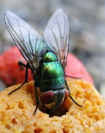 你一定看见过碧蝇吧?也就是我们通常所说的“绿头苍蝇”。它们有着漂亮的金绿色的外套,发着金属般的光彩,它们还有一对红色的大眼睛。