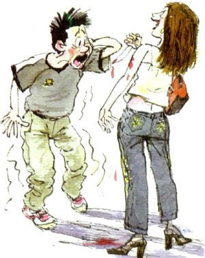 就这么着,谭明有些恍惚地跟着女孩到了路边花园的凳子上坐了下来,女孩子对他说了几句什么话,他也没听进去,只听到“试验”什么的。正当他要调整状态好好迎接这次难得的艳遇时,突然感到腰部有点隐隐的痛,急忙低头一看,原来女孩手里多了一把寒光逼人的匕首。他马上清醒了:遇上打劫的了,劫匪还是个美女。