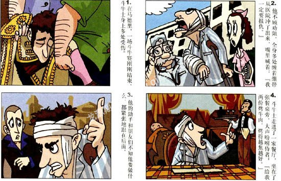 在马德里,一场斗牛赛刚刚结束,斗牛士身上多处受伤。 他不顾劝阻,全身多处缠着绷带从医院冲了出来,嘴里喊着:“我一定要报仇。” 他的助手和朋友们不知他要做什么,都紧张地跟在后面。 斗牛士走进了一家餐厅,坐在了一张餐桌旁,大声吩咐侍者:“给我上两份烤牛肉,烤得越焦越好。”