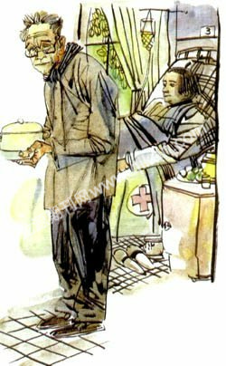 市第五医院住院部一间病房的门被轻轻推开了,走进来一位拎着个蓝色布兜的老头儿。他头发雪白,清瘦的脸上带着笑容。他走到一位半躺着的老妇人床前,那老妇人脸色发黄,满面倦容。看见老头儿,她的眼睛里闪出一丝光亮。