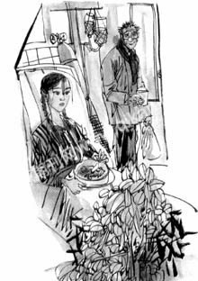 姑娘挣扎着想坐起来,老头儿忙伸手小心地扶起她,把她身后的枕头挪了挪,让她半躺着。然后,老头儿从上衣的右兜里掏出一把花瓷勺,在衣襟上蹭了一下,递过去。姑娘看着饭菜,脸上露出为难的表情,说:“我不想吃。”