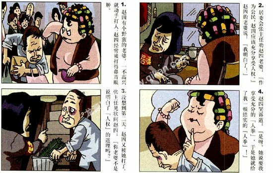 赵四有个野蛮的老婆,一不高兴就动手打人,赵四经常被打得鼻青眼肿。 没想到第二天,赵四又被她打了。张主任见状问赵四:“你老婆不是说明白了‘人权’的道理吗?” 居委会张主任劝赵四老婆:“作为公民,赵四应该充分享受人权。”赵四的老婆说:“我明白了!” 赵四哭诉道:“是呀,她说要我享受充分的‘人拳’,于是她就给了我一顿结实的‘人拳’!”