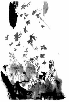 这时,茶楼里已经挤满了人,但却鸦雀无声,只有窗外的鸟鸣声声传来。只见箫翁举起碧绿长箫,缓缓吹奏起来。顿时,一声声洪亮的箫声飞扬,像是“吱吱喳喳”的鸟鸣声,悦耳动听。窗外的鸟儿们都被惊动了,随着箫声飞鸣不已,却没有一只飞进茶楼的窗口。
