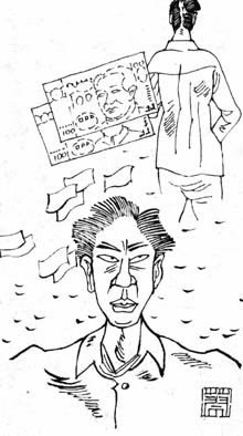 今天碰上个黑心老板,小李心里连连叫苦。可饭吃到肚子里吐不出来呀?小李万般无奈,只得认倒霉,从衣兜里掏出了钱包。