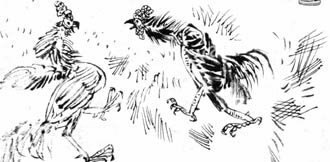 红公鸡并未将黑公鸡放在眼里,它没有放慢速度,而是拍着翅膀腾空跃起,径直落在了一只母鸡的背上。这时黑公鸡狠狠地扑了过来,却不料红公鸡轻盈一跳躲开了,而且在空中灵巧地掉转身来一口啄中了黑公鸡的鸡冠,尖利的爪子同时狠狠地砸在黑公鸡的头上。黑公鸡奋力挣脱,但红公鸡更快,一口准确地击中了它的眼珠。黑公鸡像无头苍蝇般在地上扑腾着,翻滚着,发出凄惨的叫声……战斗顷刻间结束了!