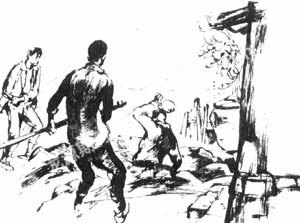 坑里的田大嘴以为开门出来的只是周老汉,恼羞成怒,忍不住破口大骂:“周白柴,你这个老王八蛋!你挖个坑想跌死我啊……”田大嘴大喊大叫的,周老汉急了,怕他激怒歹徒,匆忙拾起身边一根扁担,朝坑里砸去,一边砸一边狠狠地说:“我让你叫,我让你叫,老子就是要挖个坑跌死你!”田大嘴遭到重击,一下就瘫到了坑底。周老汉好像还不解恨,还一扁担捅到坑底。