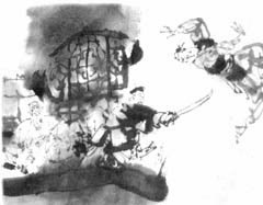 赵之焕再也忍不住了,他拔出刀来猛地扑了上去,一招“泰山压顶”,挟风带雷般向飞贼扑去。但他的刀刚砍下去,却发现飞贼已经不见了,赵之焕一招落空,紧接又是第二招,但飞贼却根本不与他正面交锋,只是用高超的轻功与他周旋。时间一久,赵之焕力气接不上,动作渐渐慢了下来。