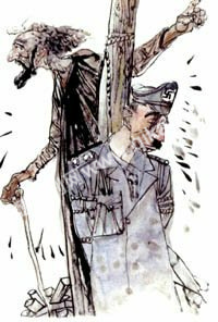 却说希特勒身上裹着一件黄色长衫,被紧紧地捆在在火刑柱上。此时的他呆如木鸡,一言不发。有个小孩子爬到柴堆上,把一张写着“这个人是世界上最大的刽子手”的标语贴在那里,希特勒看到了,忍不住破口大骂起来。