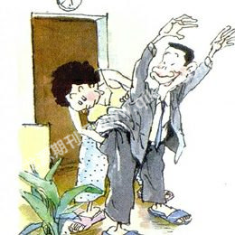 丈夫一边嘻嘻哈哈地分辩,一边乖乖地举起双手,任老婆搜身。