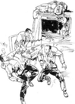这趟车乘客不多,空座位很多,有个乡下小伙子,趴在小桌上正打瞌睡,小桌上放着一个包袱,他的对面没人坐,那两个假记者就在小伙子的对面坐下了。