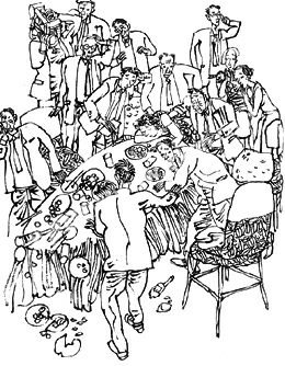 闲聊几句,我就告辞去了厨房。六点三十分,庆祝宴会正式开始,八十名客人显得兴致勃勃。