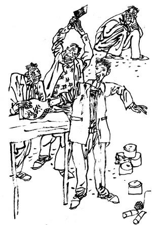 这时候,小乐往院子里一扭脸,看见他爸爸正蹲在地上,背对着屋门抽烟呢,这当儿他才发现,原来他爸爸的头发都已经花白了,他想起在以往的日子里,爸爸为他付出了多少心血,心里不禁一阵难过,眼泪“滴答”“滴答”直淌,但事情已经到了这份儿,他也只能豁出去了,他右手连带着花瓶往桌子上轻轻一搁,就等着挨刀了。丁老板把小乐右胳膊上的袖子往上挽了挽,低声说了句:“孩子啊,对不住了!”接着,他双手把刀高高举过头顶……