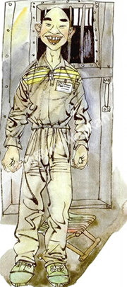 “坐下,不要站起来!”赵老师一脸严肃,仿佛在训斥一个不听话的孩子。突然,他第三次点了丁丁的名字:“丁小东!”这一次丁丁喊了声“到”,刚想站起来就坐下了。赵老师望着他也禁不住笑了,同学们也笑了,气氛十分活跃。那一刻,丁丁仿佛忘了自己是个犯人,也笑了。