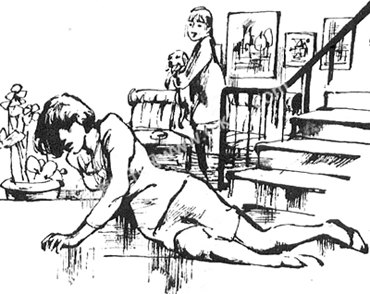 话音未落,突然,只听“咚咚咚”一连声响,傻姑吓了一跳,抬眼看时,不知怎么的,主人米贝贝从楼梯上直滚下来,“砰”的一声掉在地上不动了,额头上都流出了血。傻姑慌忙站起身来,可是当她看看怀里的加利又犹豫了,加利好像一离开怀抱就要趴下,傻姑记起主人说过,不管什么事都没有加利重要。她看看加利又看看主人,急得两头不是,一急她这傻劲就出来了。