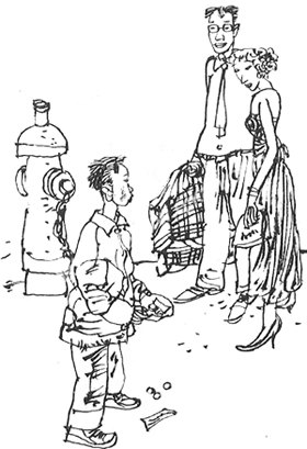 那女的看了小铁柱一眼,随手向小碗中丢下一枚硬币,边走边说道:“这谁家的小孩?没钱上学,真可怜呀!”