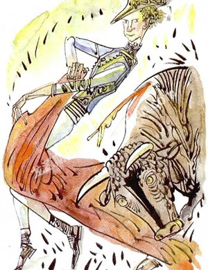 此时,阿方索听到观众席上人们有节奏地呼喊着自己的名字,又紧张又兴奋,他整理好比赛服,深吸一口气,便带着前所未有的自信,笑容满面地走到场地中央。待向四周看台上的观众致礼之后,他潇洒地将手中的红色斗篷一挥,做了个“放牛过来”的姿势。这时,只见场地边上的小木门一动,一头膘肥体壮的公牛,如离弦之箭射了出来。