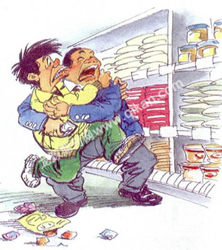 这天一大早,朱老板亲自上阵,刚转到糖果区,就见一个胖小子正大模大样地吃奶糖,嘴里一边嚼着,手里还一边剥着,上下衣服口袋更塞得鼓鼓的。朱老板气得全身的血往头上涌,一个箭步冲过去,一把提起胖小子的领子,大喝一声:“好小子,偷东西偷到我姓朱的地盘上来了,看我不收拾你!”说着就抡起了粗壮的胳膊。