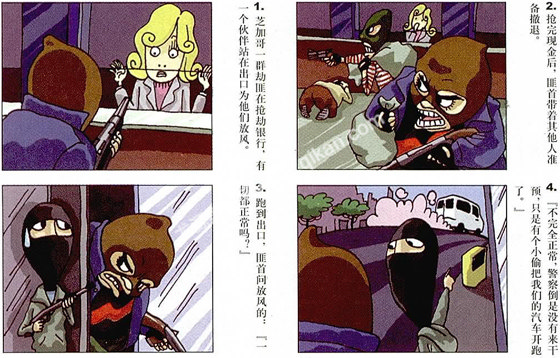 (文:张晓腾;图:包丰一) 1.芝加哥一群劫匪在抢劫银行,有一个伙伴站在出口为他们放风。 2.抢完现金后,匪首带着其他人准备撤退。 3.跑到出口,匪首问放风的:“一切都正常吗?” 4.“不完全正常,警察倒是没有来干预,只是有个小偷把我们的汽车开跑了。”