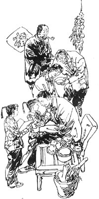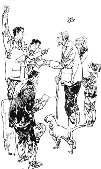 丁老先生听了介绍,非常高兴,路过煎饼摊子时,他亲热地向丁大嫂打招呼,寒暄着:“真是太麻烦你了,你女儿呢?等会我们从学校回来,带上你女儿一块回来。”丁大嫂扬手一指,说:“到学校上学去了……您老别客气,一点家常饭,没什么麻烦的。”